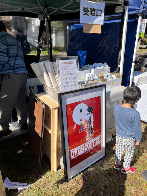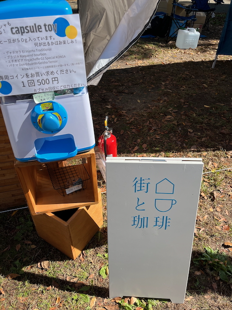 次に目を惹いたのが「コーヒーガチャ」の存在。「街と珈琲」でした。「パナマゲイシャ」も入っているという触れ込みだったのでこれが500円ならば!とガチャを引かせてもらいました。結果はブラジルでしたが、豆50g入っていますから、損はしていませんね。コーヒーもお店のブレンドを飲むことにしました。深煎りを売りにしていて、ドリッパーも「コーノ式」を使っていました。一口飲んで思わず「美味いっ」と言葉が出ました。深煎りと言っても苦味より甘みが際立つ、深煎りの良いところを抽出したようなコーヒー。晴れてはいるもののちょっと風が冷たくなってきたこの日の天気に何だかピッタリで、休憩がてら腰を下ろしてしばらく味わっていました。