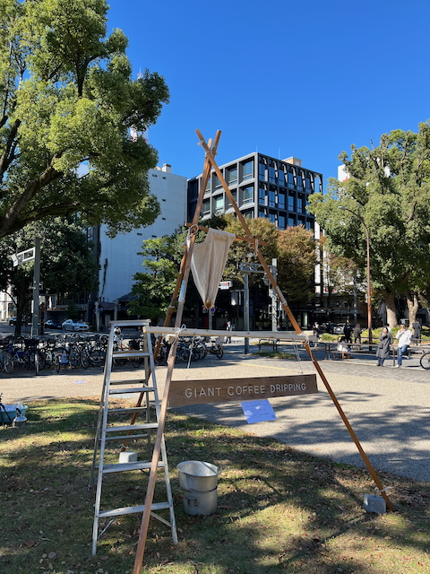 さて次は…と目を向けるとこの博覧日恒例の「巨大ドリッパー」でコーヒーをドリップしていました。ドリッパー、というよりネルドリップですかね。これは毎回行われるパフォーマンスです。