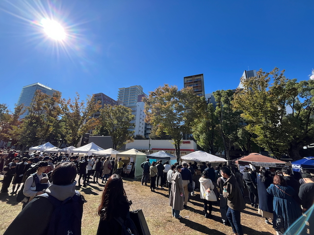 過去2回とも昼前後からの到着だったのでかなり売り切れなども出ていたのですが、今回は朝から時間があったので、11時前に着くことができました。地下鉄久屋大通駅を降りて北へ向かうと、かなりの人だかりが。前よりスケールアップしてますね~。公園のほぼ北端に迫ろうかという範囲まで広がっていました。