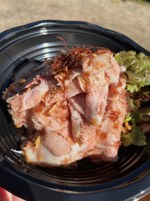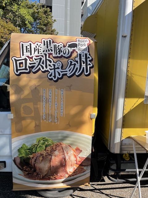 そうこうしているうちに午後1時になっていました。お腹が空いたし、キッチンカーが出ている「ボッケーノ」さんのビザでも…と思うものの、やっぱり人気店ですね、長蛇の列です。他に「ローストポーク丼」のキッチンカーが出ていたので、そちらに並びました。会場近くのお店が出しているようです。並か大盛りか迷って波にしましたが、大盛りでも良かったかも(笑)。美味しかったです。ごちそうさまでした。