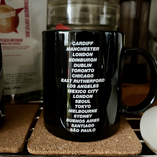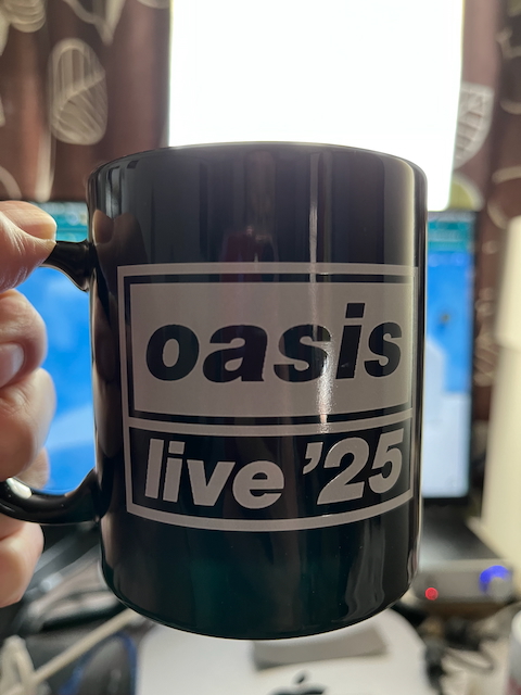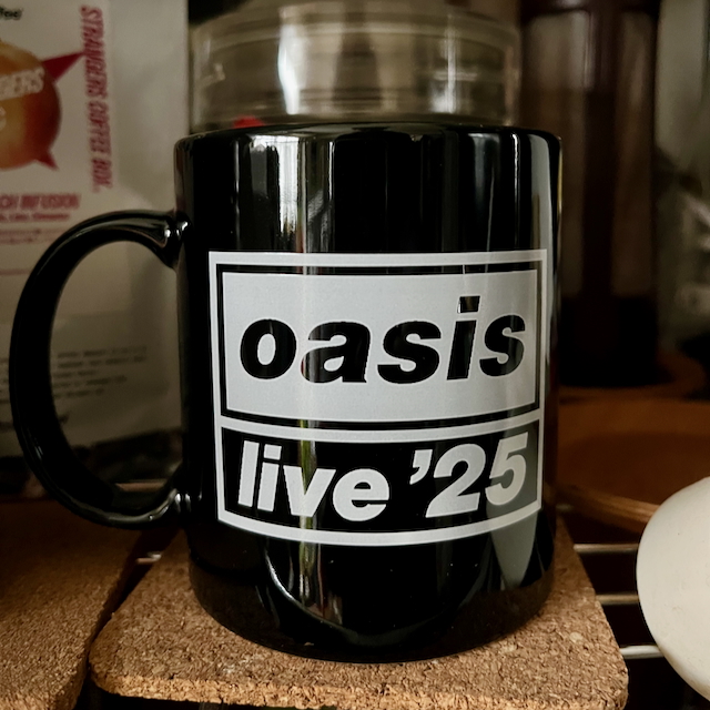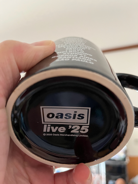マグカップは黒地に「OASIS Live ’25」とシンプルなロゴに、背面はツアーに回る都市が順番に書かれているのがツアーグッズを感じさせてくれて何だかエモいです。「オアシス、本当に復活してツアーしているんだ」みたいな。大きさは250ml入る容量なのでちょうどいい感じですね。コーヒーに、カフェオレに、存分に使っていきます。